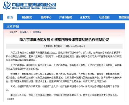 战略协议显示,中核集团将联合相关企业,在津规划建设中核集团高端新产业发展基地,加快发展一批国内领先的高端产业,培育发展一批新兴产业,在天津构建具有高附加值、高技术含量、自主知识产权的集团产业链体系。